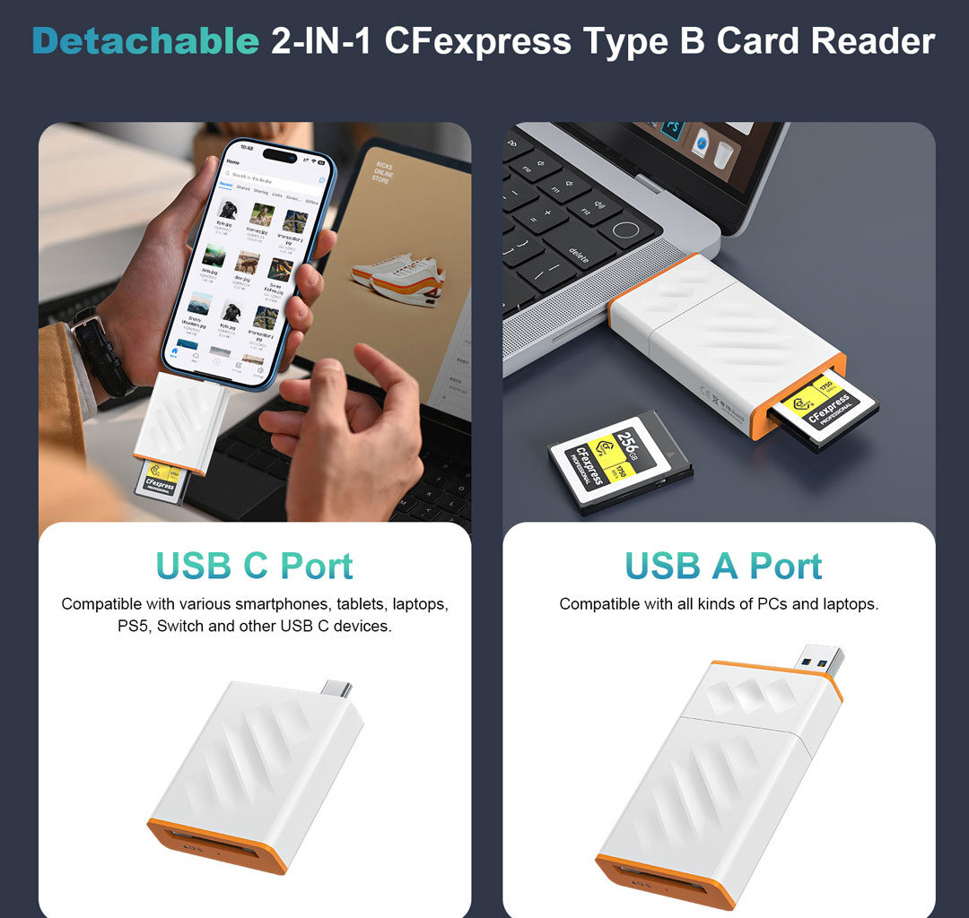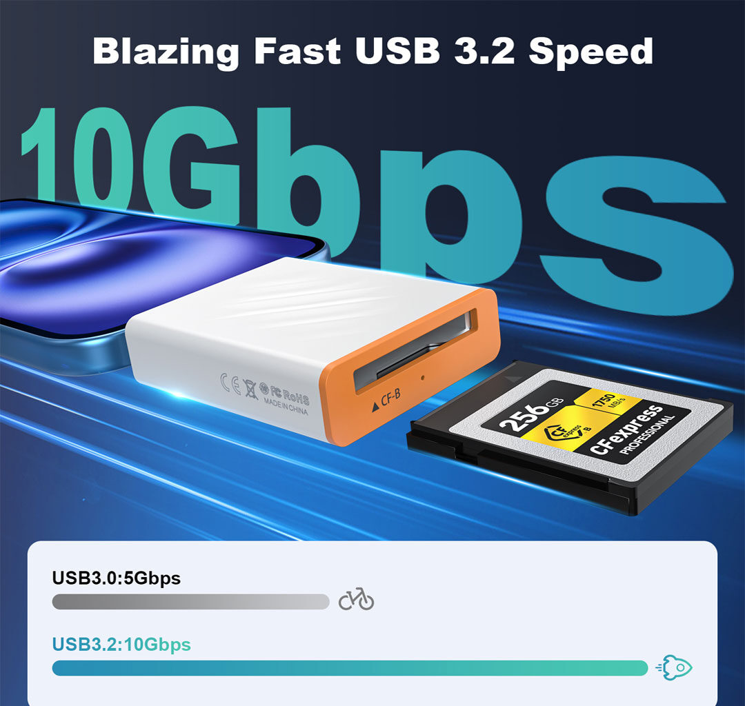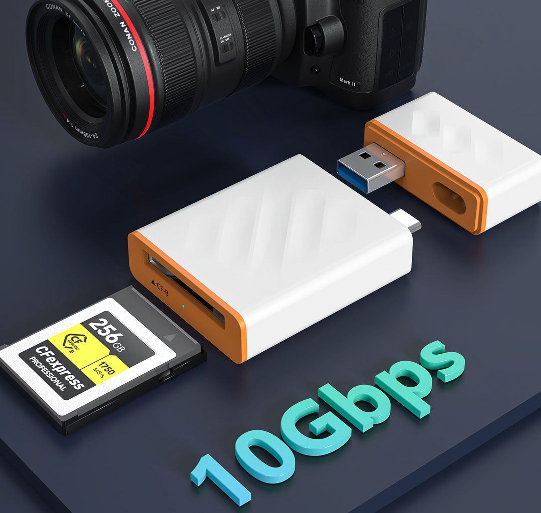 Transfer large files in seconds with this high-performance CFexpress Type-B memory card reader. Powered by USB 3.1 Type-C Gen 2, it delivers blazing-fast speeds of up to 10Gbps, making it ideal for professional photography and video workflows.