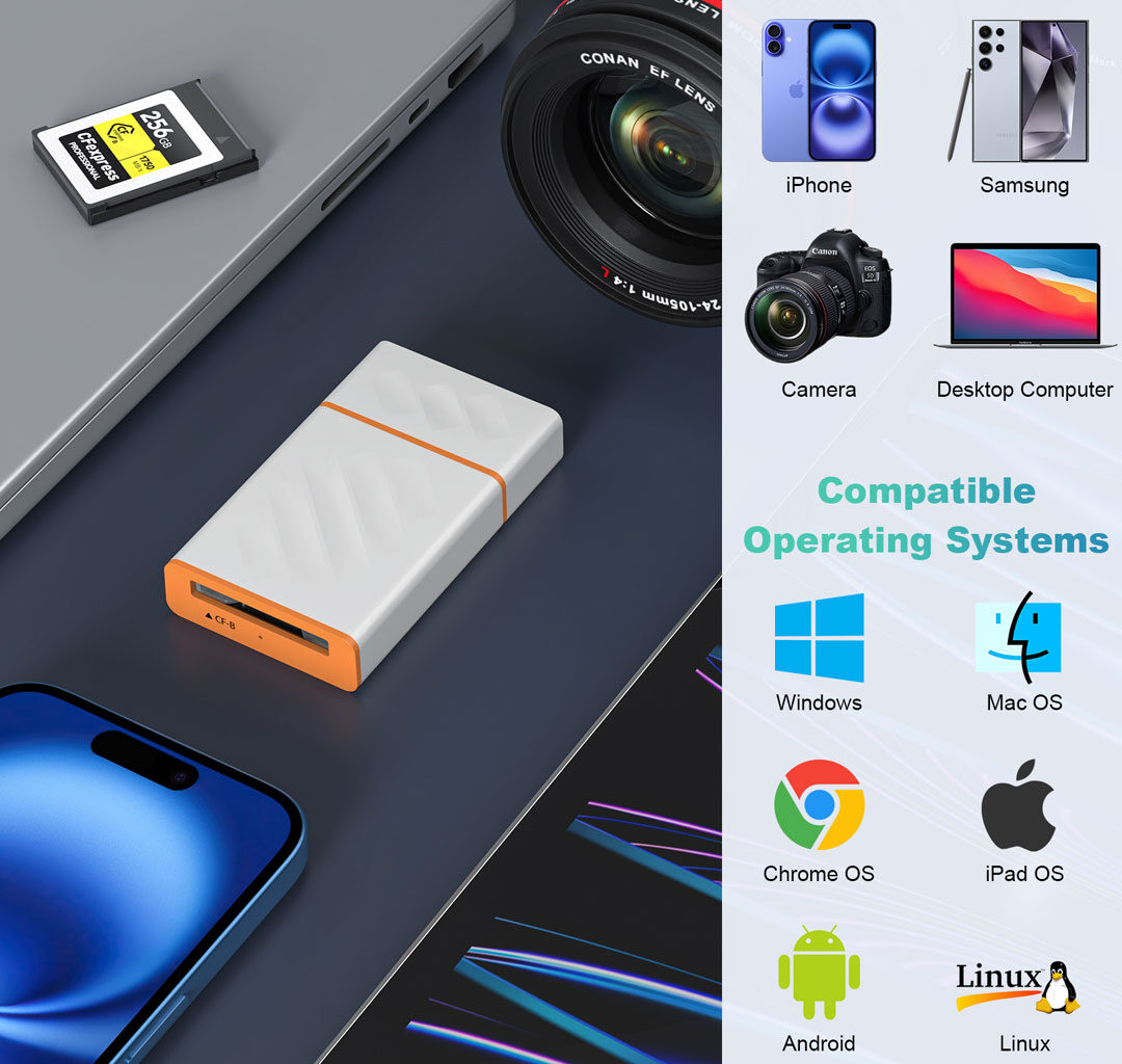 Designed for convenience, it features external plug-and-play installation with no drivers required. Fully compatible with Windows, macOS, Linux, and Android, this compact reader ensures seamless data transfer across all your devices—anytime, anywhere.